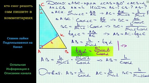 Геометрия Высота, проведенная из вершины прямого угла треугольника, равна h, острый угол равен α. Найдите стороны треугольника.