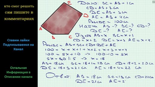 Геометрия Найдите стороны пятиугольника ABCDE, если BC на 1 см больше AB, CD на 2 см больше AB, DE на 3 см больше AB, AE на 4 см больше AB