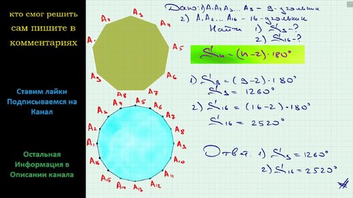 Геометрия Найдите сумму углов выпуклого: 1) девятиугольника; 2) шеснадцатиугольника.