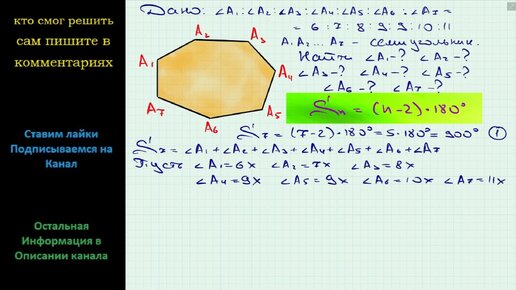 Геометрия Найдите углы выпуклого семиугольника, если они относятся как 6:7:8:9:9:10:11