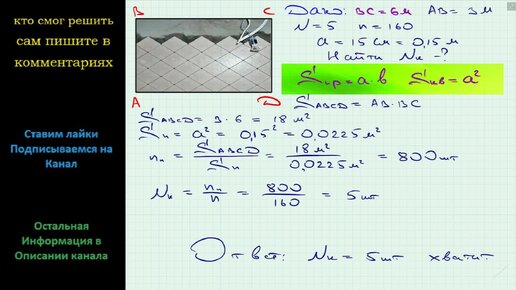 Геометрия Длина стены равна 6 м, а высота 3 м. Хватит ли пяти ящиков кафеля, чтобы облицевать им эту стену, если одна плитка имеет форму