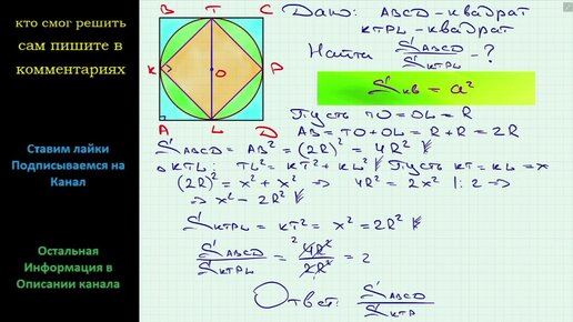 Геометрия Во сколько раз площадь квадрата, описанного около окружности больше площади квадрата, вписанного в эту окружность