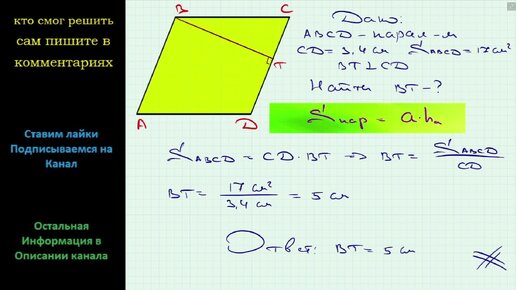 Геометрия Площадь параллелограмма равна 17 см2, а одна из его сторон 3,4 см. Найдите высоту параллелограмма, проведенную к этой стороне