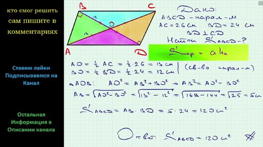 Геометрия Найдите площадь параллелограмма, диагонали которого равны 26 см и 24 см, а одна из них перпендикулярна стороне параллелограмма