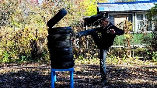 Удар мае-гери в прыжке на разных уровнях по стопке шин. Идеи для уличных тренировок.