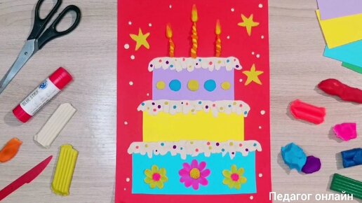 Торт на день рождения. Открытка своими руками. Поделка из бумаги и пластилина
