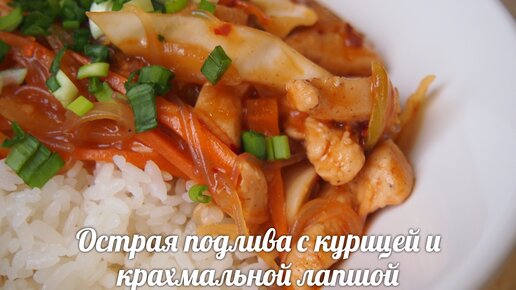 Корейская кухня: Острая подлива с курицей и крахмальной лапшой (매운닭고기당면덮밥)