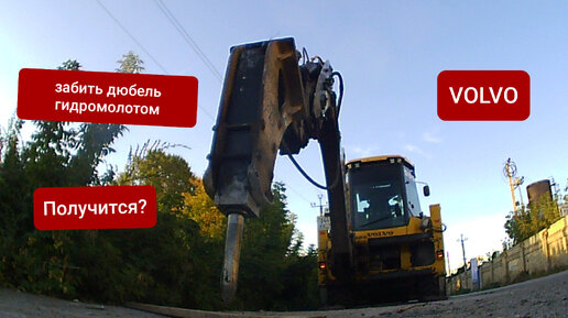 Экскаватор погрузчик забивает гвоздь (дюбель) гидромолотом.