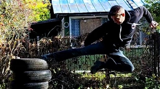 Тоби йоко-гери. Удары на разных уровнях по пирамиде из шин.