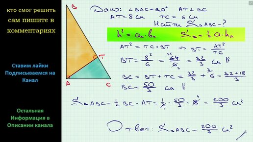 Геометрия Высота прямоугольного треугольника, проведенная к гипотенузе, равна 8 см, а проекция одного из катетов на гипотенузу 6 см Найдите