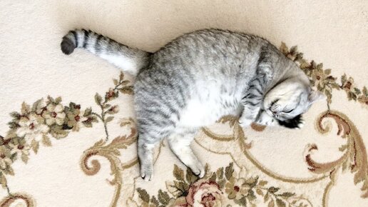 Котик Маню умывается на ковре.