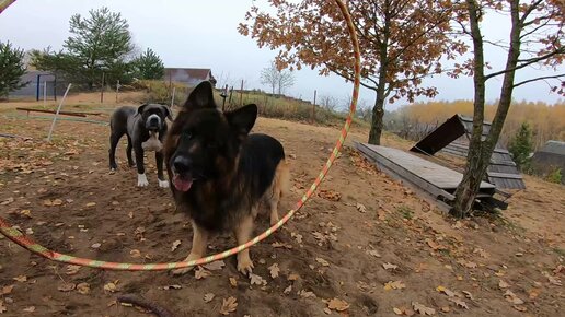 Овчарка и канекорсо прыгают через обруч