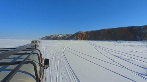 Озеро Байкал - поездка на автомобиле по льду возле острова Ольхон. Зима в Сибири. Снег