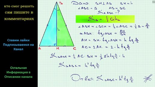 Геометрия Высота равнобедренного треугольника, проведенная к основанию, равна h, а угол при вершине равен β. Найдите площадь треугольника