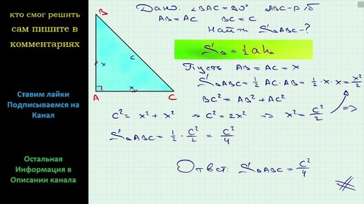 Геометрия Найдите площадь равнобедренного прямоугольного треугольника, гипотенуза которого равна c