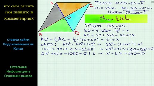 Геометрия Найдите площадь ромба, сторона которого равна 39 см, а разность диагоналей 42 см