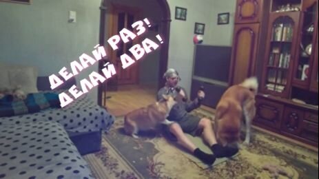 Бабуля делает утреннюю зарядку вместе с корги и акита-ину.