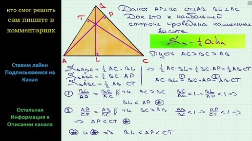 Геометрия В треугольнике проведены три высоты. Докажите, что к наибольшей стороне треугольника проведена наименьшая высота