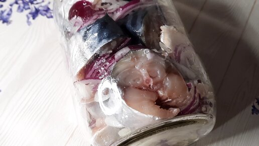 Малосольная скумбрия в банке за 2 часа и можно кушать с лучком и маслом .