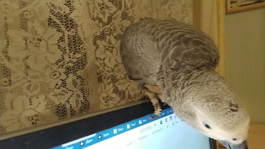 Дашка (попугай жако) гуляет по столу, пытается грызть проигрыватель и смотрит своими милыми глазками в камеру