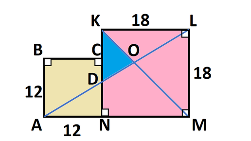Два квадрата и треугольник DOK. Чему равна его площадь