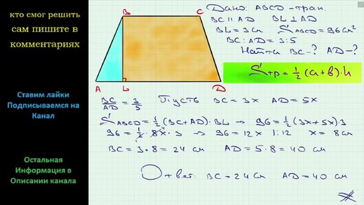Геометрия Площадь трапеции равна 96 см2, а ее высота 3 см. Найдите основания трапеции, если они относятся как 3:5