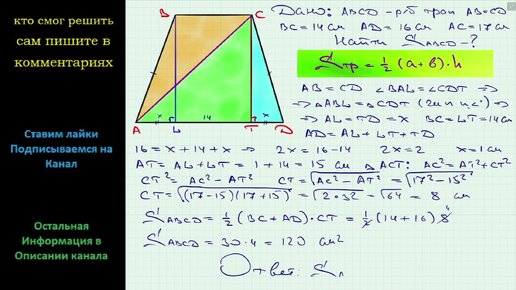 Геометрия Найдите площадь равнобокой трапеции, основания которой равны 14 см и 16 см, а диагональ 17 см