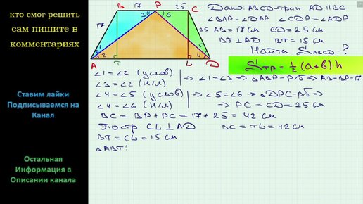 Геометрия Точка пересечения биссектрис острых углов при основании трапеции принадлежит другому основанию. Найдите площадь трапеции, если