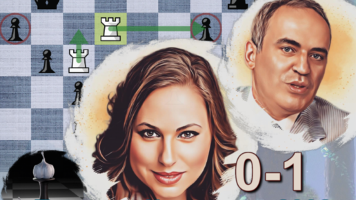 Юдит Полгар нагло получает лишние белые пешки в красивой игре против Гарри Каспарова и безоговорочно забирает победу (Москва, 2002, 1-0)