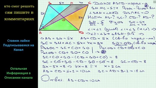 Геометрия Биссектриса угла BAD параллелограмма ABCD пересекает сторону BC в точке M так, что BM:MC = 5:4. Найдите стороны параллелограмма