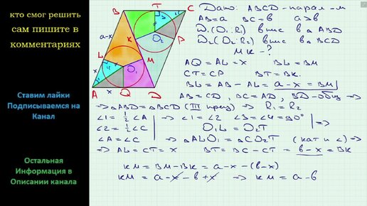 Геометрия В параллелограмме ABCD известно, что AB = a, BC = b, a > b. Окружности, вписанные в треугольники ABD и CBD, касаются диагонали BD
