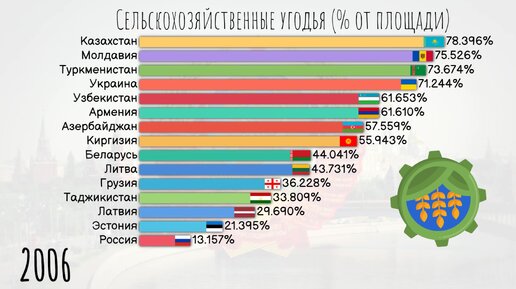 Сельскохозяйственные угодья (% от общей площади).Сравнение стран бывшего СССР 1992-2019.Статистика