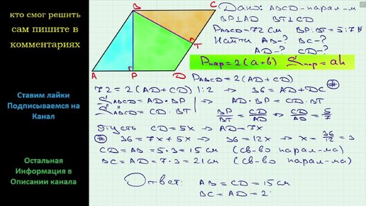 Геометрия Периметр параллелограмма равен 72 см, а его высоты относятся как 5:7. Найдите стороны параллелограмма