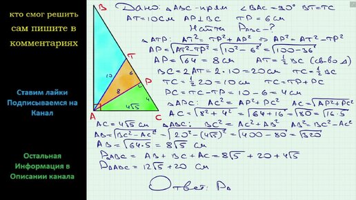 Геометрия Медиана прямоугольного треугольника, поведенная к гипотенузе, равна 10 см, а расстояние между серединой гипотенузы и основанием