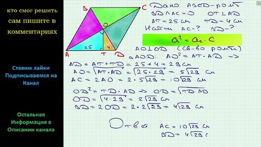 Геометрия Перпендикуляр, проведенный из точки пересечения диагоналей ромба к его стороне, делит ее на отрезки длиной 4 см и 25 см. Найдите