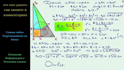 Геометрия Катеты прямоугольного треугольника равны 6 см и 8 см. Найдите расстояние от вершины меньшего острого угла треугольника до центра