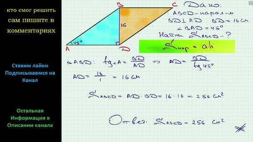 Геометрия Найдите площадь параллелограмма ABCD, если BD┴AD, BD = 16 см, угол A = 45