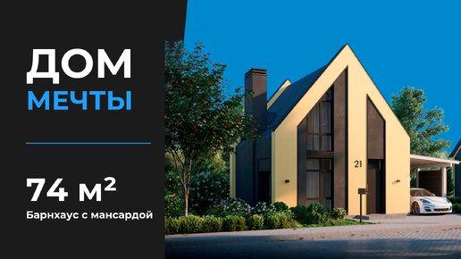 Проект дома барнхауса с мансардой и террасой, 74 кв. м