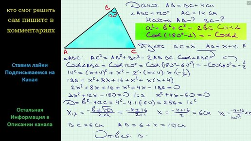 Геометрия В треугольнике ABC сторона AB на 4 см больше стороны BC, угол B = 120, AC = 14 см. Найдите стороны AB и BC