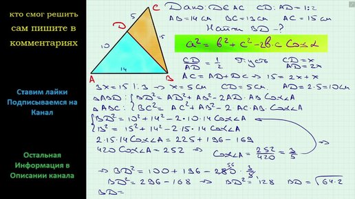 Геометрия На стороне AC треугольника ABC отметили точку D так, что CD:AD = 1:2. Найдите отрезок BD, если AB = 14 см, BC = 13 см, AC = 15 см
