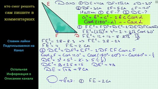 Геометрия Найдите неизвестную сторону треугольника DEF, если:1) DE = 4 см, DF = 2√3 см, угол D = 302) DF = 3 см, EF = 5 см, угол F = 120