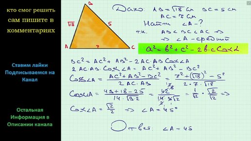 Геометрия Стороны треугольника равны √18 см, 5 см и 7 см. Найдите средний по величине угол треугольника