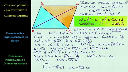 Геометрия Стороны параллелограмма равны 2√2 см и 5 см, а один из его углов равен 45 Найдите диагонали параллелограмма