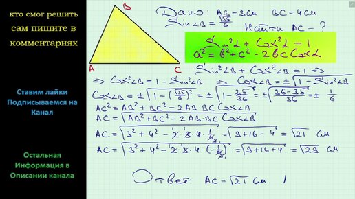 Геометрия Две стороны треугольника равны 3 см и 4 см а синус угла между ними равен √35/6 Найдите третью сторону треугольника Сколько решений