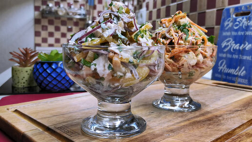 Два ярких салата с курицей на скорую руку. Меняем два ингредиента и получаем совершенно разный вкус