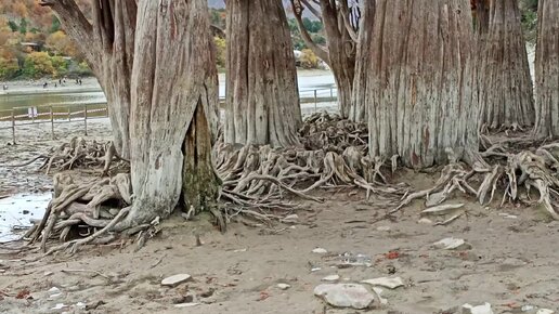 Когда обнажаются корни болотных кипарисов на озере Сукко, то десятки туристов устраивают фотосессии на фоне деревьев, игнорируя ограждение
