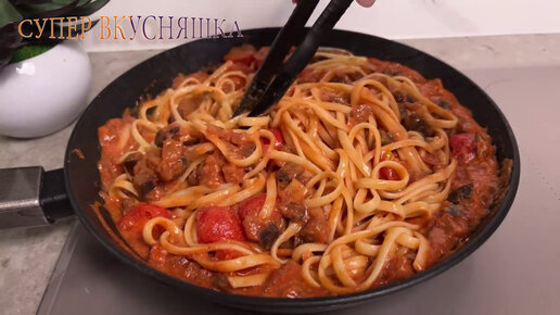 Самая простая и очень вкусная в приготовлении сырно-сливочная паста на сковороде с запеченными баклажанами в томатном соусе с чесноком