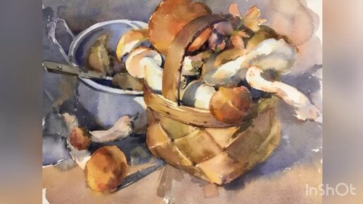 Корзина с грибами. Автор Марина Ласаева. #акварель #акварельнаятехника #акварельнаяживопись #живопись #watercolor