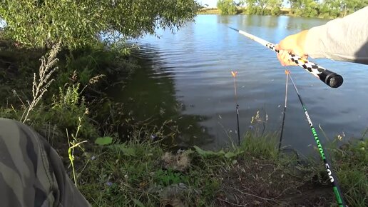Ловля на маховую удочку . Рыбалка на деревенском пруду на поплавок.