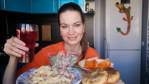 МУКБАНГ ПАСТА КАРБОНАРА, БЕЛЯШИ, САЛАТ, ФРУКТЫ/MUKBANG HALK FAMILY